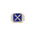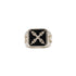 Side view of stone signet ring in brushed sterling silver showing middle finger motif
